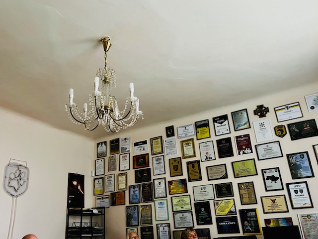 From the ceiling hangs a chandelier whilst on the walls hang plaques shield and certificates of thanks from some of the units, they have provided bespoke equipment for.